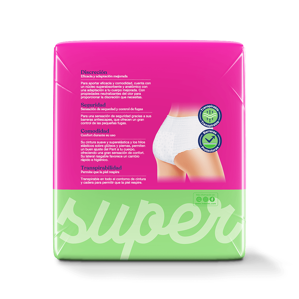 Indasec® Discreet Pant con tecnología Invisible System se adapta mejor en la zona de la entrepierna, evitando incómodos abultamientos. Indasec® Discreet Pant es más estrecho. Con Indasec Pant podrás disfrutar los momentos más especiales sin ninguna preocupación, gracias a que garantiza la mayor absorción y discreción además de control del olor.